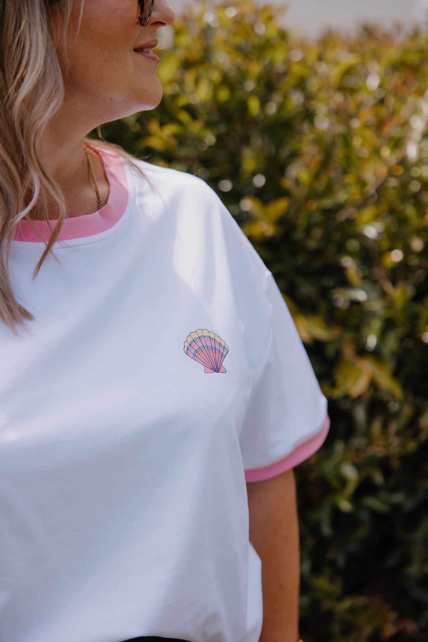 - Crisp white tee with contrast pink neckline and sleeve cuffs