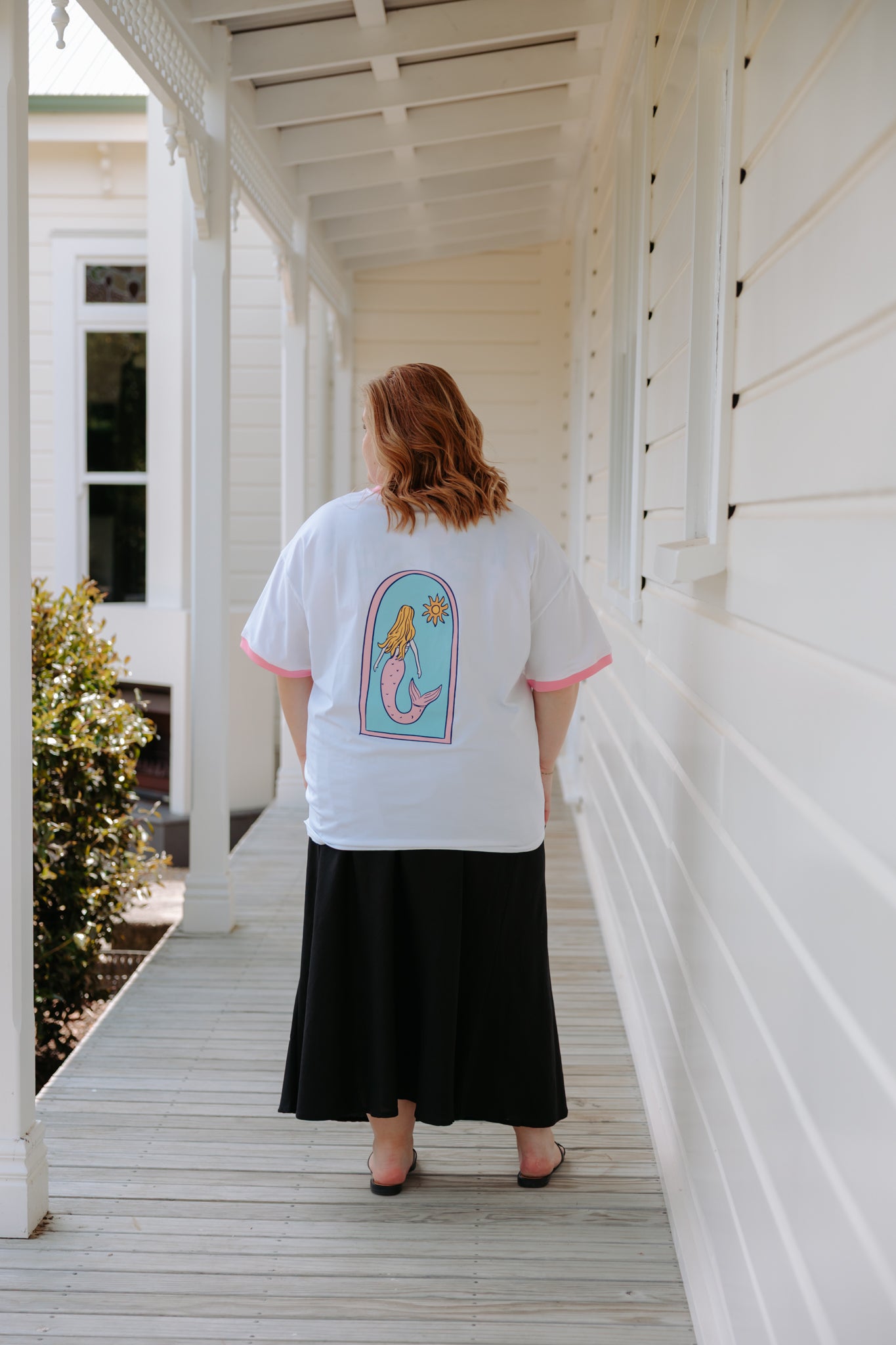 Our new Band Tee… your new easy throw on with a fun pop of colour. Relaxed, comfy and a little bit playful, this one is made for everyday wear. The standout is the dreamy mermaid artwork on the back with soft pastel tones and a little sunshine moment.